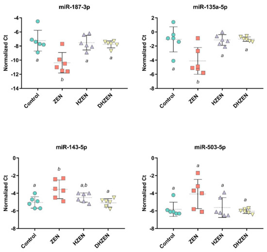 Normalized Ct-values of miR-187-3p, miR-135a-3p, miR-143-5p, and miR-503-5p in the uterus tissue of piglets exposed to uncontaminated feed (Control), ZEN, HZEN, or DHZEN (d28, n = 6). Individual symbols represent individual pigs. Significant differences between groups are indicated with dissimilar superscripts a,b (p < 0.05).