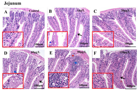 The effects of different doses of MC-LR on the histopathology of the jejunum in mice. A–F illustrates the microstructure of the jejunum in mice. Bar = 100 μm means original magnification ×400. Microstructure of the jejunum of mice in different groups (A, B, C, D, E and F represents the control group, 1 μg/L dose group, 30 μg/L dose group, 60 μg/L dose group, 90 μg/L dose group and 120 μg/L dose group, respectively). (A) The intestinal villi were well-structured and coherent, and the crypts were neatly arranged; (B) the jejunal microstructure showed that the goblet cells increased by 38%, and the arrangement of intestinal epithelial cells were disordered; (C) the intestinal villi were invaginated and serrated; (D) the arrangement of intestinal epithelial cells was disordered and lymphocyte infiltration was observed; (E) obvious lymphocyte infiltration and disorder crypts were observed; (F) the intestinal villi were found to be invaginated and serrated. The red five-pointed star indicates the intestinal villi were invaginated and serrated. The black arrow indicates an arrangement disorder of the intestinal epithelial cells, and the blue arrow shows the infiltration of lymphocytes. The blue asterisk indicates an increase in goblet cells. The red triangle indicates a disordered arrangement of crypts.