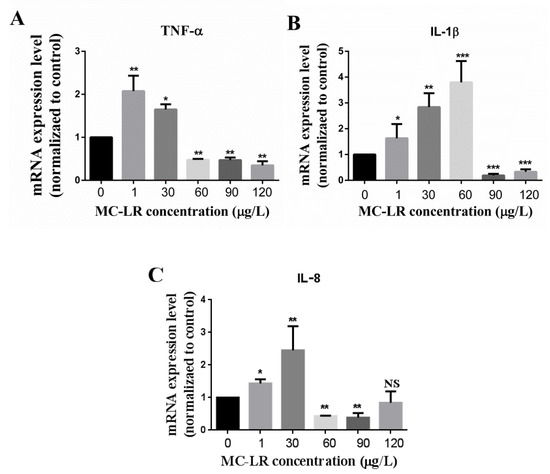 The effects of MC-LR on the pro-inflammatory factors mRNA expression levels of the jejunum in mice. (A) mRNA expression levels of pro-inflammatory factor TNF-α in 0, 1, 30, 60, 90 and 120 μg/L MC-LR treatment groups; (B) mRNA expression levels of pro-inflammatory factor IL-1β in 0, 1, 30, 60, 90 and 120 μg/L MC-LR treatment groups; (C) mRNA expression levels of pro-inflammatory factor IL-8 in 0, 1, 30, 60, 90 and 120 μg/L MC-LR treatment groups. * indicates p <0.05, ** indicates p <0.01, *** indicates p <0.001, NS means no significance.