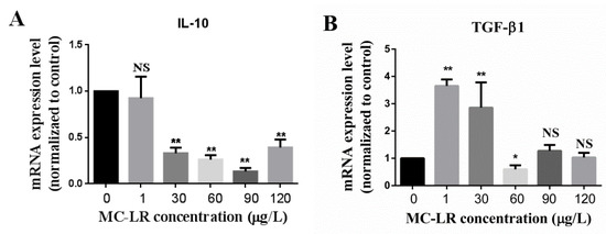 The effects of MC-LR on the anti-inflammatory factors mRNA expression levels of the jejunum in mice. (A) mRNA expression levels of anti-inflammatory factor IL-10 in 0, 1, 30, 60, 90 and 120 μg/L MC-LR treatment groups; (B) mRNA expression levels of anti-inflammatory factor TGF-β1 in 0, 1, 30, 60, 90 and 120 μg/L MC-LR treatment groups. *indicates p <0.05, ** indicates p <0.01, NS means no significance.