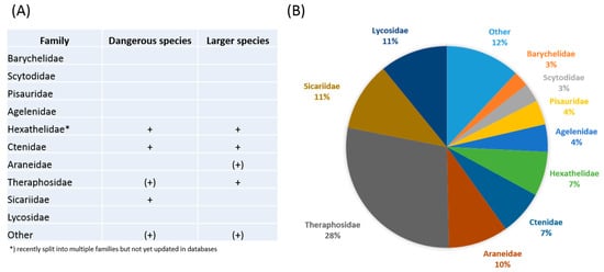Taxonomic bias in spider venom research. Given in (A) are spider families which have been studied for their venom so far, together with an assignment of threat potential and size. Brackets indicate that only a small fraction of included species are either dangerous or large. Further note that the grouping “other” in reality represents the remaining 109 spider families, thus “other” contains the majority of spider biodiversity. (B) Visualizes the percentage of deposited toxin sequences per family. Current knowledge on spider venom is mostly based on data from those larger and more dangerous lineages and therefore is taxonomically biased. Data from [5,7,8]; see [6] for an in-depth discussion on taxonomic bias in spider venom research.
