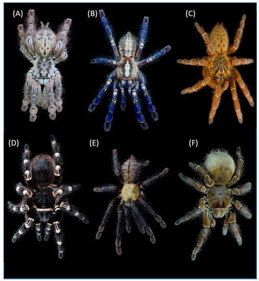 Venom-wise understudied and over-studied members of Theraphosidae. Several lineages within the theraphosid radiation were mostly neglected in the past. The upper row includes representatives of such lineages, reflecting some of the herein evaluated priority groups: (A) Heteroscodra maculata (Stromatopelminae), (B) Poecilotheria metallica (Poecilotheriinae), and (C) Pterinochilus murinus (Harpactirinae). On the other hand, some lineages are responsible for the bulk of knowledge that is available on tarantula venom: (D) Acanthoscurria geniculata (Theraphosinae), (E) Cyriopagopus schioedtei (Ornithotoctoninae), and (F) Theraphosa stirmi (again, Theraphosinae). Photography is courtesy of Bastian Rast, Switzerland.