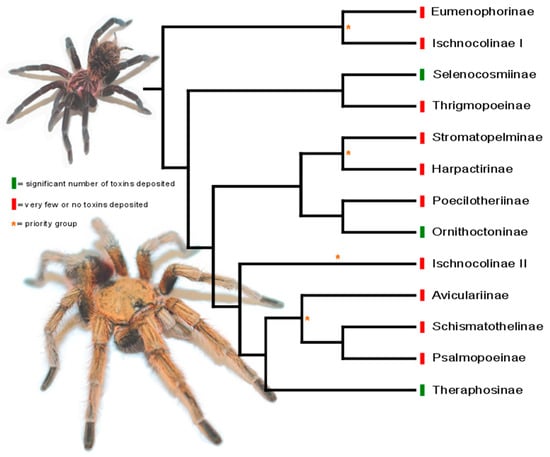 Priority groups for venom-based biodiscovery programs assigned to the tarantula tree of life, encompassing the 12 so far phylogenetically assessed subfamilies within Theraphosidae (cladogram based on [29]). The subfamilies Ornithoctoninae, Selenocosmiinae, and Theraphosinae dominate in terms of deposited toxin sequences (green), whereas little or no information is available for the other subfamilies (red). Entire theraphosid clades, representing major radiations within the family, are almost completely unrepresented and are therefore considered priority groups (red asterisk), including the clade of Eumenophorinae and Ischnocolinae, the African clade of Harpactirinae and Stromatopelminae, and the non-theraphosine new-world tarantulas. Note that the subfamily Ischnocolinae is paraphyletic and therefore appears twice in the phylogeny.