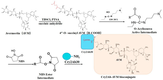 In this study, we used bioconjugation to evolve the Bt toxin to enhance its insecticidal activity and improve affinity to its binding proteins. 1-Ethyl-3-(3-dimethylaminopropyl) carbodiimide (EDC) and N-hydroxysuccinimide (NHS) were selected as the couplers, which are carboxyl and amine-reactive zero-length crosslinkers [18]. EDC/NHS reacted with the carboxylic group of the bioconjugation ligand first, and formed an NHS ester intermediate that reacted with an amino group of Bt toxin to form a stable amide bond [19]. Cry2Ab30 was chosen as the target Bt toxin to be modified, which is a 65 kDa 3D-Cry of Bt toxin [20]. Cadherin, formed by a number of characteristic cadherin repeats (CR) domains, a membrane-proximal extracellular domain (MPED), a transmembrane domain, and a cytoplasm domain, serves as an important binding protein for several classes of Cry toxins [21]. For example, Spodoptera exigua cadherin was reported can bind both Cry1Ac and Cry2Aa [22]. Here, the 10th and 11th CR domains (1258–1602 aa) in the Plutella xylostella cadherin (PxCR10–11) were expressed and chosen as the Cry2Ab-binding protein [23]. Avermectin (AVM) belongs to a family of compounds called the macrocyclic lactones (MLs), and was introduced to the market in the 1980s as an antiparasitic drug and agricultural pesticide [24]. The mode of action of MLs is based on their interaction with the receptor channels for inhibitory neurotransmitters. However, MLs also irreversibly bind to other receptors with high affinity in a process involving macrocyclic groups, such as glutamate and glycine receptors [25,26]. Therefore, AVM was selected as the bioconjugation ligand with regarding to its structure–activity, with the aim of improving the affinity of Cry2Ab30 to its binding proteins. Here, AVM was first carbonylated to synthesize 4”-O-succinyl avermectin to improve its bioconjugation activity. Cry2Ab–AVM was then synthesized by bioconjugating 4”-O-succinyl avermectin onto Cry2Ab30 via EDC/NHS, which enhanced the insecticidal activity against P. xylostella up to 154.4-fold over Cry2Ab30 and led to binding of PxCR10–11 with a higher affinity. These results established an approach to the evolution of Bt toxins and provided a new platform for the engineering of other protein-binding biomolecules.
