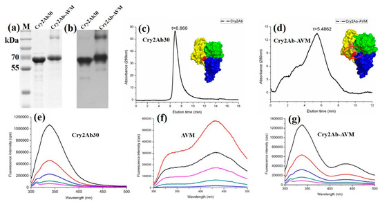 Cry2Ab30 and Cry2Ab–AVM were detected by 10% SDS-PAGE with Coomassie brilliant blue staining (Figure 2a). Cry2Ab–AVM showed an obvious shift in molecular weight compared with Cry2Ab30 (65 kDa), which demonstrated that 4”-O-succinyl avermectin had been conjugated onto Cry2Ab30. Both Cry2Ab30 and Cry2Ab–AVM were detected by anti-Cry2Ab antibody (Figure 2b), and the results suggested that they were free of any major disturbances to the structure of Cry2Ab30 due to the bioconjugation of 4”-O-succinyl avermectin. We also ran size-exclusion chromatography to detect whether 4”-O-succinyl avermectin was conjugated onto the Cry2Ab30. As shown in Figure 2c,d, the elution time of Cry2Ab–AVM was earlier than Cry2Ab, suggesting that the bioconjugation of 4”-O-succinyl avermectin onto Cry2Ab30 increased the molecular weight of Cry2Ab30.