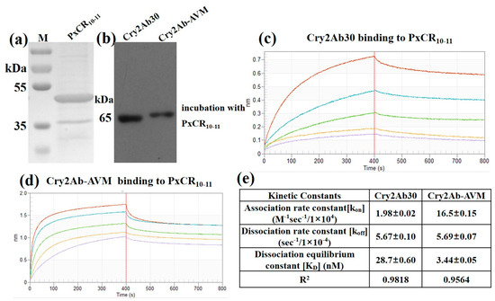 In our previous study, PxCR10–11 is found to be the binding fragment of Cry2Ab30 in P. xylostella cadherin, and may be involved in the action of Cry2Ab30 against P. xylostella [23]. Qiu et al. also reported that the CR7-MPED region in the S. exigua cadherin played an important functional binding site for both Cry1Ac and Cry2Aa, but they did not compete for the same binding site, which suggested that they may bind to diverse cadherin protein epitopes. When cadherin transcription was suppressed by oral RNAi knockdown, the susceptibility of S. exigua larvae to both Cry1Ac and Cry2Aa was significantly reduced. These results suggested that cadherin serves as a specific Cry2A target [22]. Zhao et al. also reported that cadherin may function as receptors for Cry2Aa in Helicoverpa armigera and play important roles in the toxicity of the Cry2Aa toxin [29]. Here, PxCR10–11 was expressed in the Escherichia coli expression system and was further purified using a GST-Sefinose prepacked gravity column (Figure 3a). Ligand blot assay revealed that both Cry2Ab30 and Cry2Ab–AVM could bind PxCR10–11 (Figure 3b). To further assess the kinetic constants of Cry2Ab30 or Cry2Ab–AVM binding to PxCR10–11, Fortebio biolayer interferometry was employed. As shown in Figure 3c,d, Cry2Ab30 and Cry2Ab–AVM both had strong binding affinity to PxCR10–11, characterized by rapid association and slow dissociation. Cry2Ab–AVM showed a significantly higher association rate constant (kon) than Cry2Ab30. The KD value for the binding of Cry2Ab30 to PxCR10–11 was 28.7 nM, which was 8.34-fold larger than that of Cry2Ab–AVM (3.44 nM) (Figure 3e). The results revealed that bioconjugation engineering on Cry2Ab30 could significantly improve its binding affinity to PxCR10–11.