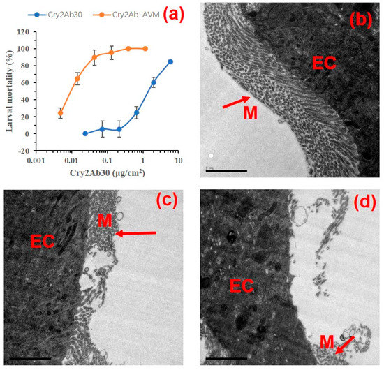 The insecticidal activities of Cry2Ab30 and Cry2Ab–AVM against P. xylostella. (a) The susceptibility of second-instar larvae of P. xylostella to Cry2Ab30 and Cry2Ab–AVM. Data are shown as the mean ± standard error of the mean (n = 3). Ultrastructural (TEM) imaging of general aspects of midgut of P. xylostella (b), the midgut fed with Cry2Ab30 (c), and midgut fed with Cry2Ab–AVM (d). EC = epithelial cell; M = microvilli. The scale bar is 2 μm.