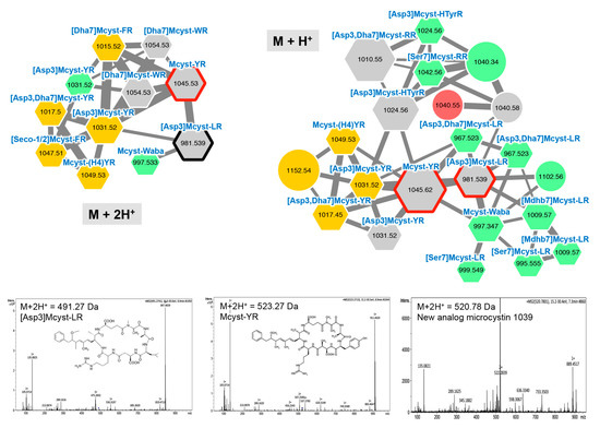 Two main microcystin clusters highlighted by the GNPS analysis based on the MS/MS CID (collision ion dissociation) fragmentation spectra obtained from the Planktothrix strains. Analytes whose individual masses match with known microcystins are indicated by hexagons. Correspondences with standard microcystins similarly analyzed or with components, whose fragmentation patterns are available in library of the GNPS server, are indicated by heavy red and black lines, respectively. The color code is similar to the one in the Figure 1 caption. Examples of MS/MS spectra and chemical structures are shown for [Asp3] Mcyst-LR, Mcyst-YR, and a potential new microcystin variant exhibiting a m/z of 1040.58 Da. Note that (M + H)+ and (M + 2H)2+ ions are grouped in two distinct molecular clusters.