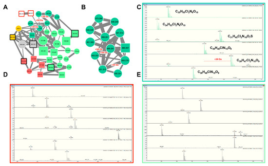 Two aeruginosin clusters highlighted by the GNPS analysis based on the MS/MS CID fragmentation spectra obtained from the four Planktothrix strains. Analytes whose individual masses match with known aeruginosins are indicated as squares with sharp corners (A,B). Correspondences with standard aeruginosins similarly analyzed or with components, whose fragmentation patterns are available in library of the GNPS server, are indicated by heavy red and black lines, respectively. The color code is similar to the one in Figure 1. Selection of isotopic pattern of various aeruginosins observed in the strains PCC 7805 (C), PCC 7821 (D), and PCC 10110 (E), respectively. Note that these isotopic patterns indicate the presence of mono- or di-chlorinations exclusively for aeruginosins of the PCC 7805 strain. The +34 Da mass shift between potentially non-, mono-, and di-chlorinated molecules is indicated in red.