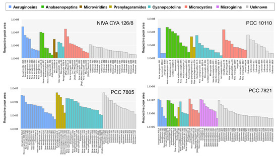 The biomass (20 mL) of the four Planktothrix strains cultured in triplicate was centrifuged at 4000 rpm for 10 min. The supernatants were discarded, the pellets were freeze-dried and lyophilized. Firstly, the metabolite extraction efficiency was tested on the four strains testing four procedures (A—single extraction with ACN/MetOH/H2O 50%/30%/20% v/v, B—single extraction with MetOH/H2O 80%/20% v/v, C—single extraction with MetOH/H2O 30%/70% v/v, and D—double extraction with MetOH/H2O 30%/70% v/v, then with MetOH/H2O 80%/20% v/v). The extraction “B” showed the best efficiency with results similar to the ones of the double extraction procedure and, thus, was then further selected. Then, the lyophilized cells were weighted and sonicated for 2 min in 80% methanol with a constant ratio of 100 µL of solvent for 1 mg of dried biomass and centrifuged at 4 °C (12,000× g; 5 min). Two microliters of the supernatant representing the metabolite extracts were then analyzed in triplicate on an ultra-high-performance liquid chromatograph (UHPLC Ultimate 3000, Thermo, Waltham, MA, USA) using a Polar Advances II 2.5 pore C18 column (Thermo, Waltham, MA, USA) at a 300 µL·min−1 flow rate with a linear gradient of acetonitrile in 0.1% formic acid (5%–90% in 21 min) coupled with a high-resolution mass spectrometer. The eluted metabolite contents were analyzed using an electrospray ionization hybrid quadrupole time-of-flight (ESI-QqTOF) high-resolution mass spectrometer (Maxis II ETD, Bruker) on positive simple MS or on positive autoMS/MS mode with information-dependent acquisition (IDA), on the 50–1500 m/z range at 2 Hz or between 2 and 8 Hz speed, for MS and MS/MS respectively, according to relative intensity of parent ions, in consecutive cycle times of 2.5 s, with an active exclusion of previously analyzed parents. The data were analyzed with the DataAnalysis 4.4 software for internal recalibration (<0.5 ppm) and MGF exports were generated from MS/MS spectra between 1 and 15 min. The raw MS and MS/MS data were investigated with MetaboScape 4.0 software (Bruker, Bremen, Germany) in order to automatically search and group together all classical adduct forms ([M + H]+, [M + 2H]+, [M + 3H]+, [M + Na]+, [M + K]+, and [M + NH4]+) using a threshold value of 0.8 for the co-elution coefficient factor. Metabolite annotation was attempted according to the precise mass of the molecules and their respective MS/MS fragmentation patterns with regards to an in-house database of above 700 cyanobacteria metabolites and confirmed with 36 commercially available standard molecules from the various cyanobacterial specific metabolite families (e.g., cyanopeptolins, aeruginosins, microginins, anabaenopeptins, aerucyclamides, microcystins, saxitoxins, anatoxins, and cylindrospermopsins) analyzed similarly in our mass spectrometry platform.