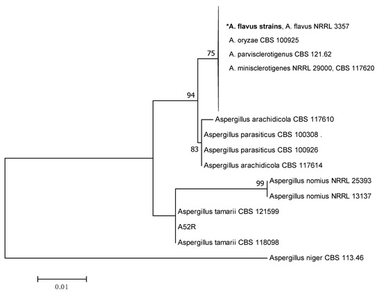 In the previous study [18], one strain (A52R) has been morphologically identified as A. nomius due to the production of AFB, AFG, aspergillic acid and limited growth on CZ agar at 42 °C. However, molecular analysis based on the sequences of ITS and β-tubulin region revealed the identity as A. tamarii. It was found to be an unusual observation of A. tamarii since it was able to produce aflatoxins, which is contradictory to its typical characteristics. According to [15], A. tamarii does not produce aflatoxins, and it has been used in the food industry for the production of soy sauce and various enzymes such as amylases, proteases and xylanolytic enzymes since a long time ago.