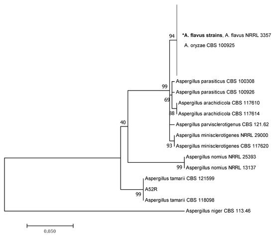 Therefore, the objectives of the present study were to molecularly confirm the identity of A. flavus and A. nomius from the previous study [18], to determine the phylogenetic relationships among the Aspergillus section Flavi strains, and to detect the presence of aflatoxin biosynthesis genes in those strains.