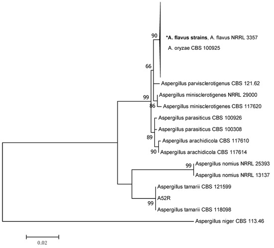 The aflatoxin-producing ability of A. flavus in the previous study [18] was found to be inconsistent since a large number of strains were found to be non-aflatoxigenic. Other than the environmental conditions, the ability of A. flavus to produce aflatoxin is highly determined by the genetic variation of the strains. It could be due to any disruption in the aflatoxin biosynthesis genes or belong to other species that do not produce aflatoxin. The aflatoxin biosynthesis gene cluster has been sequenced and extensively studied in order to understand the mechanism and biosynthesis pathway of aflatoxin in aflatoxigenic fungi [26]. The presence of these genes is required by the Aspergillus spp. to produce aflatoxin, and any changes therein might cause disruption in the biosynthetic pathway. The precise identification of Aspergillus section Flavi is therefore important to determine the risk of aflatoxin contamination as results in the previous study [17,18] indicated a high occurrence of these species in raw peanuts (imported) and peanut-based products marketed in Malaysia.