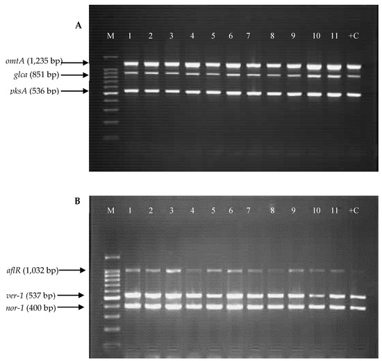 The PCR method was used to amplify the targeted aflatoxin biosynthesis genes aflR, aflP (omtA), aflD (nor-1), aflM (ver-1), pksA, and one sugar utilisation gene, glcA. The glcA gene, which is located adjacent to the 3′ end of aflatoxin biosynthesis gene cluster, was used as a positive marker for A. flavus, as this gene is consistently present in this species regardless of toxigenic potentials [29,30]. Figure 4A,B show the representative amplification patterns of the reference strain A. flavus NRRL 3357 and the aflatoxigenic A. flavus isolates from Chemotype V in Multiplex PCR set 1 and 2, respectively. All the targeted genes were successfully amplified and corresponded to the sizes of their PCR products. The results support the ability of these strains to produce aflatoxin.