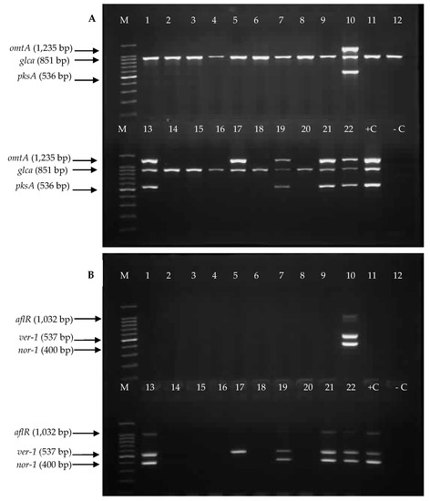 Molecular analysis on the aflatoxin biosynthesis gene cluster has proven to be most useful to differentiate the aflatoxigenic and non-aflatoxigenic strains of A. flavus. In recent decades, aflatoxin biosynthesis genes have been targeted for the detection of aflatoxigenic fungi in food samples, as the presence of these genes is compulsory for the synthesis of aflatoxin [9,43,44,45]. According to [43], the variability in the aflatoxin gene cluster that exists in the A. flavus population is useful in order to understand the risk of aflatoxin contamination as well as the selection of biocontrol agents.