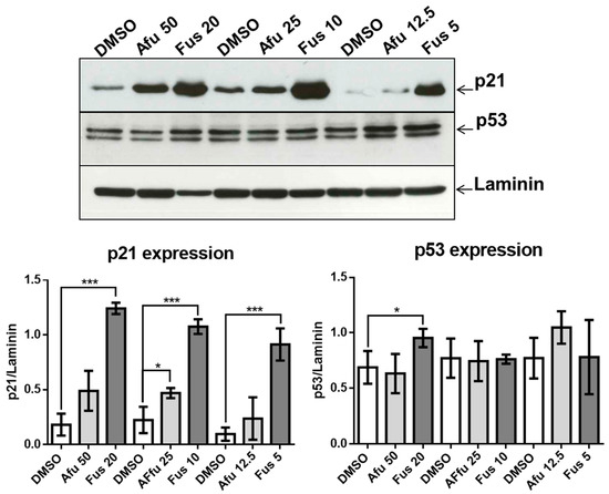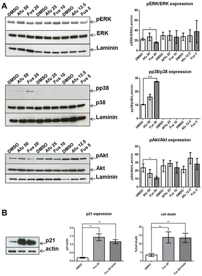 In conclusion, we showed that FUS and AFU derived from the endophytic fungi Cladosporium species isolated from Rauwolfia serpentina exert anti-proliferative and pro-apoptotic effects on tumor and primary cells, in part due to MAPK-dependent up-regulation of p21. Further studies are needed to clarify whether these compounds could be used in cancer therapy.