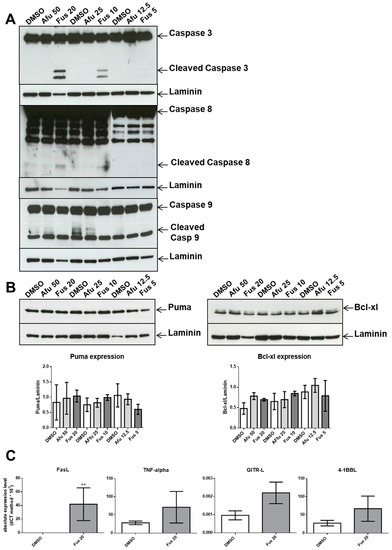 20]. The absence of caspase-9 activation by the tested compounds is notable because it commonly participates in p21-induced apoptosis. This lack of caspase-9 activation and intrinsic pathway contribution was verified by a lack of changes in the expression of Bcl-xL or PUMA, which are proteins involved in the intrinsic apoptosis pathway. By contrast, FUS increased the activation of caspase-8 through elevated production of FasL. This is a novel finding, as FasL expression is usually not associated with p21 expression. We hypothesize that FUS can provide cells undergoing p21-dependent senescence with an escape mechanism from apoptosis through activation of the extrinsic pathway. However, additional experiments are needed to define the exact mechanisms induced by FUS, which could clarify which cell death pathway is activated by AFU, as caspase-3 was not activated by this compound. AFU could induce cell death via other pathways, such as necrosis or necroptosis, which are two mechanisms of caspase-independent cell death. Alternatively, AFU could stimulate a yet unknown mechanism of cell death.
