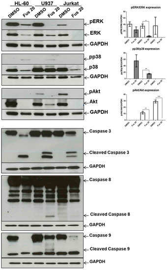 Our results confirm the efficacy of FUS and AFU in blocking the growth of hematologic cancer cell lines by both promoting cell apoptosis and inhibiting cell cycle progression through the involvement of p21 and p53. These are two fundamental molecules in proliferation and apoptosis [