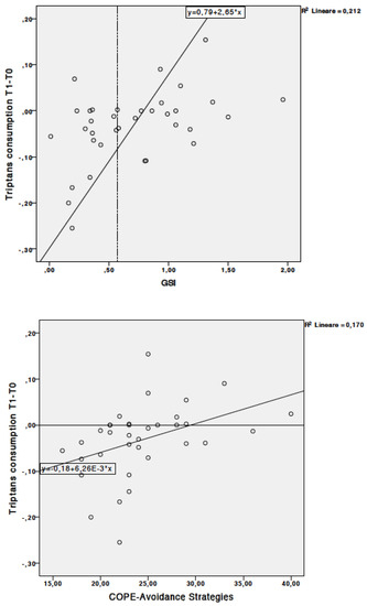 Changes in triptans consumption and psychological distress and avoiding strategies. Panels A (upper): Abscissa indicates the change in triptans consumption between T1 and T0. Ordinate indicates psychological distress (GSI). Panel B (lower): Abscissa indicates the change in triptans consumption between T1 and T0. Ordinate indicates avoidance strategies.