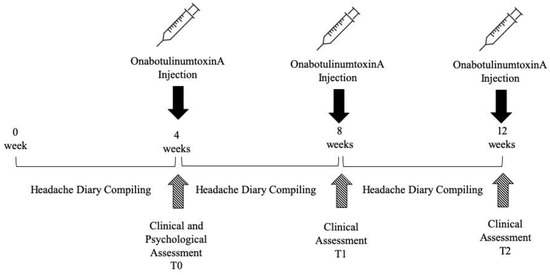 A prospective observational cohort study was performed from March 2018 to February 2019. The study is part of to the project “EXploring PsychoLOgical needs of patients with chronic pain attending neuroREhabilitation services” (EXPLORE) involving the Neurorehabilitation Unit and the Clinical Psychology Unit of the Verona University Hospital and the Neurology Unit of the Sacro Cuore Hospital in Negrar (north Verona). Outpatients with a confirmed diagnosis of CM made by a neurologist according to the Classification ICHD-III (beta) and eligible to OnabotulinumtoxinA prophylaxis were recruited [2,10]. OnabotulinumtoxinA injections were performed at the Neurorehabilitation Unit (AOUI Verona). After the visit, the patients have been informed about the EXPLORE project and asked to participate. After signing written informed consent, included patients filled out psychological questionnaires. Conversely, demographic and clinical data were collected from the medical charts according to clinical practice. The study design is presented in Figure 2.