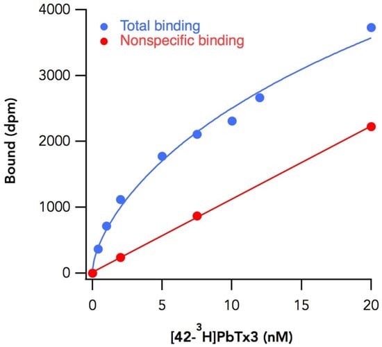 Next, 250 µg of the membrane fraction suspended in 500 µL of the binding buffer was incubated with the appropriate concentration (0.5–10 nM) of [42-3H]-PbTx3 for 3 h. The mixture was diluted with 2.5 ml of washing buffer containing 163 mM choline chloride, 5 mM Hepes (pH 7.5), 1.8 mM CaCl2, 0.8 mM MgSO4 and 100 µg/mL bovine serum albumin (BSA) and poured onto a glass fiber filter GF/C (φ25 mm, Whatman, Maidstone, UK) mounted on a vacuum manifold (1225 Sampling Manifold, Millipore, Burlington, MA, USA), which was connected to a vacuum aspirator. The glass fiber filter was washed 3 times with this buffer, mixed with 5 mL of EcoLume Liquid Scintillation Cocktail (MP Biomedicals, Irvine, CA, USA) and incubated overnight before counting radioactivity with Multi-purpose Scintillation Counter LS6500 (Beckman Coulter, Inc., Brea, CA, USA). Nonspecific binding was measured in the presence of 600 nM cold PbTx1 or PbTx3. Saturation binding curves were nonlinearly fitted to an equation for 1:1 receptor-ligand interactions using GraphPad Prism 2.0 (GraphPad Software, San Diego, CA, USA) to estimate Kd and Bmax. Experiments were done in duplicate and the reported number of experiments represents repetitions on different days.