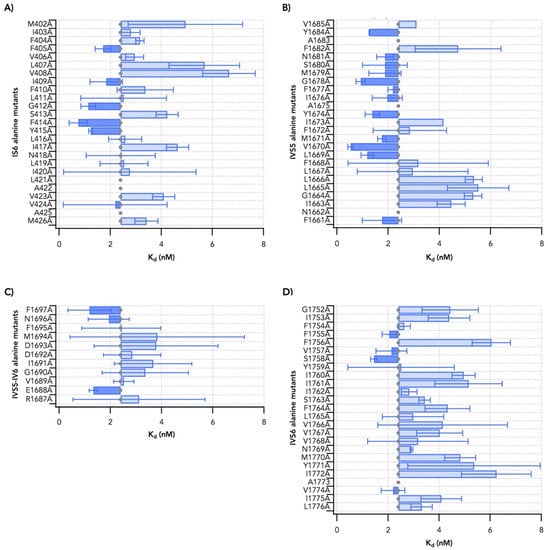 Binding of [42-3H]-PbTx3 to alanine mutants for (A) IS6, (B) IVS5, (C) IVS5-SS1 loop, and (D) IVS6.