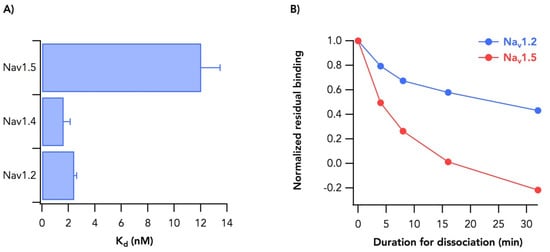 Binding of [42-3H]-PbTx3 to different channel subtypes. (A) Dissociation constants of [42-3H]-PbTx3 against Nav1.2, 1.4 and 1.5. (B) Dissociation kinetics for Nav1.2 (blue) and 1.5 (red).