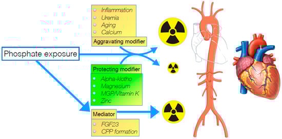 One possible way out of this stalemate situation might be to consider a different approach to mitigate the risk of a (uremic) toxin like phosphate. Since in toxicology, it is common practice to use an antidote when available, especially when it is not possible to sufficiently eliminate exposure, it is somewhat surprising that this treatment principle is, to a large extent, neglected when considering phosphate toxicity in CKD. To establish what might be the “antidote” in a setting of hyperphosphatemia, detailed consideration of how exactly phosphate inflicts harm, can provide relevant clues. Insight into factors that either mediate or modify phosphate toxicity, may be helpful in finding other ways than just targeting phosphate exposure, to alleviate morbidity induced by it. In this narrative review, several of these factors are highlighted, which might either be mediators or modifiers of phosphate toxicity as schematically depicted in Figure 1.