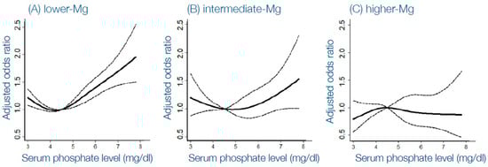 Odds ratio for cardiovascular mortality in a large Japanese cohort of patients on hemodialysis. (A) Reflects lower magnesium group, (B) intermediate magnesium group and (C) higher magnesium group. The dashed line represents the 95% confidence interval. The reference serum phosphate value is 4.5 mg/dL. Reproduced with permission from Sakaguchi et al. [53], 2014, PLoS One.