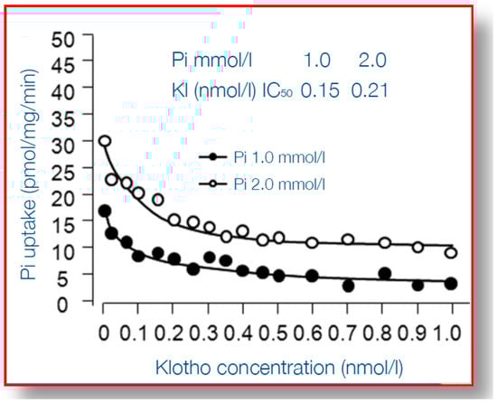 Uptake by vascular smooth muscle cells under varying concentration of α-klotho, and at two different concentrations of inorganic phosphate. On the Y-axis phosphate uptake is shown, on the X-axis concentrations of α-klotho. At higher concentrations α-klotho the uptake is inhibited, for both normal and high phosphate concentration in the medium. Reproduced with permission from Hu et al. [87] 2011, Am Soc Nephrol.