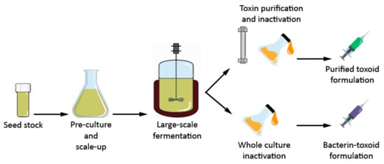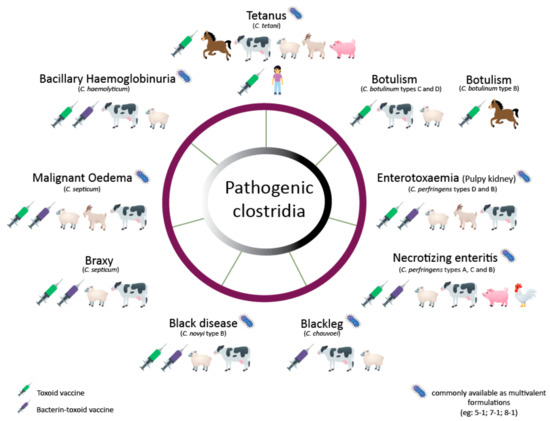 Today only tetanus is prevented with a Clostridial vaccine in humans. However, because mortality rates in unvaccinated animals are usually high, there is a large dependence on vaccination in the livestock sector. These vaccines are usually multivalent vaccines combining bacterin-toxoids produced by different Clostridium species [22]. Here, we review the production processes of several bacterin-toxoid vaccines to protect against animal pathogenic Clostridium species, including C. botulinum, C. tetani, C. perfringens, C. chauvoei, C. septicum, C. novyi and Clostridium hemolyticum (Figure 1). Furthermore, a brief description of the diseases caused by the toxins of the latter Clostridium and their virulence regulation is also included. The present work does not include C. difficile, as there are no commercially available vaccines for the prevention of its disease in animals.