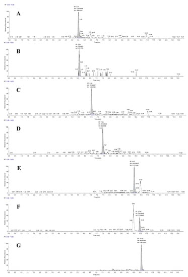 Liquid chromatography coupled to high-resolution mass spectrometry (LC-HRMS) chromatograms (Full MS) of a maize silage sample spiked at the cutoff level using a mass extraction window of ± 5 ppm, (a) deoxynivalenol at 400 µg/kg; (b) deoxynivalenol-3-glucoside at 400 µg/kg; (c) deepoxy-deoxynivalenol at 100 µg/kg; (d) 3+15-acetyl-deoxynivalenol at 100 µg/kg; (e) β-zearalenol at 400 µg/kg; (f) α-zearalenol at 500 µg/kg; and (g) zearalenone at 200 µg/kg.