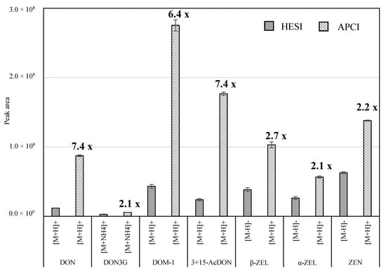 Signal intensities (means ± SD) of spiked mycotoxins in maize silage using the heated electrospray ionization (HESI) and the atmospheric pressure chemical ionization (APCI) interface (n = 3). The spiking level for each mycotoxin was 400 µg/kg. The precursor ion with the highest signal intensity in the spectra was chosen for the comparison. The increase of signal intensities using the APCI mode compared to the HESI mode is given as numbers above the bars. DON = deoxynivalenol; DON3G = deoxynivalenol-3-glucoside; DOM-1 = deepoxy-deoxynivalenol; 3-AcDON = 3-acetyl-deoxynivalenol; 15-AcDON = 15-acetyl-deoxynivalenol; β-ZEL = β-zearalenol; α-ZEL = α-zearalenol; ZEN = zearalenone.