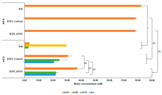 Molar concentrations (nM) of aflatoxin B1 (AFB1) and metabolites (AFM1, AFP1, and aflatoxicol (AFL)) for incubation of AFB1 with S9 fractions from rat liver, black soldier fly larvae (Hermetia illucens L., BSFL)-control, and BSFL-AFB1 after directly halting enzymatic activity (t = 0 h) and after 2 h of incubation. Significance of differences is indicated in the figure with * (p ≤ 0.05) or NS (not significant, p > 0.05).