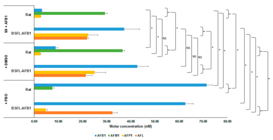 Molar concentrations (nM) of AFB1 and metabolites (AFM1, AFP1, and AFL) for incubation of AFB1 with S9 fractions from rat liver and BSFL-AFB1, and with dimethyl sulfoxide (DMSO) or DMSO + cytochrome P450 inhibitor piperonyl butoxide (PBO) added, after 2 h of incubation. Significance of differences is indicated in the figure with * (p ≤ 0.05) or NS (not significant, p > 0.05).
