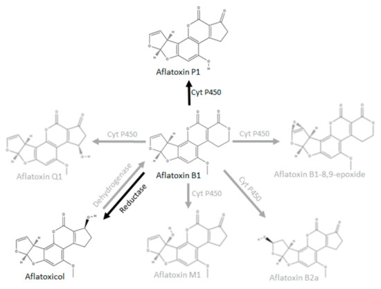 Since AFB1 is converted to AFL by a cytosolic NADPH-dependent reductase [24,28,29], we therefore propose that this conversion to AFL by BSFL occurs via the same pathway. Figure 3 shows selected metabolic conversion pathways known for AFB1. The black arrows denote metabolic pathways that have been found to be active in BSFL S9 fractions in this study; the grey arrows denote known pathways in other species.