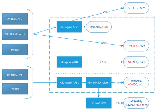 Schematic representation of treatments (control treatments within dotted lines; red letters indicate the difference between that treatment and the + S9 + AFB1, t = 2 h treatment).