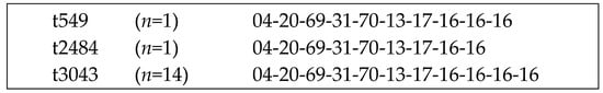 The investigation of the whole genome sequences (WGSs) of the 19 isolates revealed two multi locus sequence (MLS) types, ST1 (n = 3, allelic profile: 1-1-1-1-1-1-1) and ST1660 (n = 16, allelic profile: 6-79-6-47-89-70-61). All ST1 isolates had spa type t127 (repeats: 07-23-21-16-34-33-13), whereas the ST1660 isolates displayed three different spa types, namely t549 (n = 1, IMT41899), t2484 (n = 1, IMT39637) and t3043 (n = 14). A comparison of these spa types revealed only differences in the number of the terminal repeats (Figure 1):