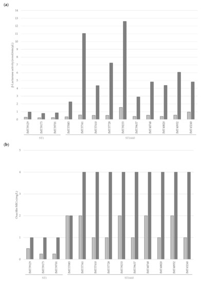 The representative isolates (all three ST1 and ten ST1660) were subjected to β-lactamase activity testing using a nitrocefin assay. The induction with ampicillin revealed a 5.05–19.10-fold increase of β-lactamase production for the ST1660 isolates, while the ST1 isolates showed only a moderate increase (3.17–3.40-fold) (Figure 3a). The Mann-Whitney-U-Test revealed a significant difference (U = 0.0; p = 0.007) between the ST1 and the ST1660 isolates. Susceptibility testing after induction resulted, for all but one isolate, in oxacillin MICs that were one to two dilution steps higher than the corresponding values of the uninduced isolates (Figure 3b). The isolate IMT37083 (ST1660) showed no change in its oxacillin MIC of 2 mg/L. For the remaining nine ST1660 isolates tested, oxacillin MICs increased to 4 mg/L, thus they were classified as resistant. Even though the ST1 isolates showed increased oxacillin MICs of 1 mg/L, they were still classified as susceptible according to the CLSI standards [,].