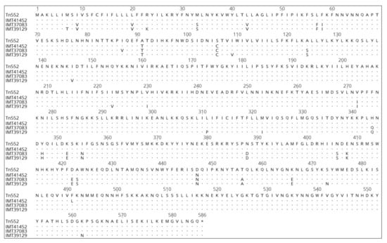 Comparison of the aa sequences of BlaR1 of IMT41452, which represents the majority of the ST1660 isolates, except the differing ST1660 isolate IMT37083, and IMT39129, which represents the ST1 isolates. The transposon Tn552 of S. aureus NCTC 9789 (acc. no. X52734.1) served as a reference. The dots indicate the identity of aa, while letters indicate aa exchanges.
