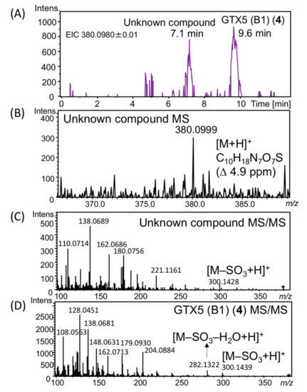 Screening for novel PST in A. circinalis (TA04) resulted in detecting an unknown peak at 7.1 min on the extracted ion chromatogram (EIC) at m/z 380.0980 ± 0.01, whereas the peak of the known PST-analogue, GTX5 (B1) (4) [22,23], was detected at 9.6 min (Figure 2A). The high-resolution (HR) MS ([M+H]+) of this unknown compound was m/z 380.0999 (C10H18N7O7S, ∆ 4.9 ppm, Figure 2B). The MS/MS spectrum (Figure 2C) showed a desulfate ion [M–SO3+H] + at m/z 300.1428, suggesting the presence of an SO3H moiety in this molecule, similar to GTX5 (B1) (4) (Figure 2D). However, this unknown compound did not show a dehydrated ion [M–SO3–H2O+H]+ (C10H16H7O3+) m/z 282.1309, whereas STX analogues that contain a hydrate ketone at C12 commonly show a dehydrated product ion in their MS/MS spectra [24,25]. For example, the MS/MS spectrum of GTX5 (B1) (4) showed the ion corresponding to [M–SO3–H2O+H]+ (C10H16H7O3+) at m/z 282.1309 (Figure 2D). Based on the above results, this novel STX analogue is a 12-deoxy type analogue and is most likely to be 12β-deoxyGTX2 or 12β-deoxyGTX3 (3), because 12α-deoxy analogues have not been identified in natural sources. Therefore, we prepared 12β-deoxyGTX2 and 12β-deoxyGTX3 (3), along with the mixture of 12α-deoxyGTX2/3, by chemical derivatization from C1/C2 to compare the chemical data.