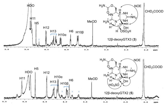 The 1H NMR spectra of synthetic 12β-deoxyGTX3 (3) and 12β-deoxyGTX2 (5) and observed key NOEs in these compounds. 600 MHz, solvent: CD3COOD-D2O (4:96, v/v). The HDO signal was suppressed. The signal of CHD2COOD (2.06 ppm) was used as an internal reference.