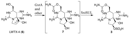 Saxitoxin (STX (1), Figure 1) and its analogues, the potent voltage-gated sodium channel blockers [1], are known as paralytic shellfish toxins (PST) [2,3]. Nearly 60 natural analogues of STX have been reported [4]. Several species of freshwater cyanobacteria and marine dinoflagellates have been identified to produce PST [2,3,4,5]. The biosynthetic pathway responsible for the synthesis of STX was first proposed by Shimizu et al. [6] by conducting feeding experiments using stable isotope-labeled acetic acid and amino acids as essential substrates with PST producing cyanobacteria and dinoflagellates. Next, Neilan’s group discovered putative STX biosynthesis gene clusters (sxt) in the cyanobacterium, Clyndrospermopsis raciborskii T3 [7]. The majority of the core set of genes (sxtA-sxtI, sxtP-sxtR, sxtS, and sxtU) were commonly identified in PST producing cyanobacteria [4]. Homologous genes to some of these genes were also found in PST producing dinoflagellate strains [8,9]. Concerning the O-sulfonation and N-sulfonation enzymes, Sako et al. [10] purified and characterized a sulfotransferase specific to N-21 of STX and gonyautoxin (GTX) 2/3, and Yoshida et al. [11] characterized a sulfotransferase specific to O-22 of 11-hydroxysaxitoxin; both enzymes were detected in the toxic marine dinoflagellate, Gymnodium catenatum. We previously identified biosynthetic intermediates of STX, namely, Int-A’, Int-C’2, Int-E’, 11-hydroxy Int-C’2, and a shunt compound, Cyclic-C’, in the PST producing freshwater cyanobacterium, Anabaena circinalis (TA04), and the toxic marine dinoflagellate, Alexandrium tamarense (Axat-2), using synthetic standards and LC–MS, along with feeding experiments. The above findings allowed us to propose a putative biosynthetic pathway responsible for STX production based on the structures of these intermediates [12,13,14,15]. Recently, Narayan’s group demonstrated the functions of some enzymes encoded in cyanobacterial PST biosynthetic gene clusters and showed a polyketide-like synthase, SxtA [16], and the enzymes that catalyze C–H hydroxylation are SxtT, SxtH, and GxtA [17]. In addition, SxtSUL and SxtN from C. raciborskii T3 were demonstrated to act as an O-sulfotransferase and N-sulfotransferase, respectively [18].