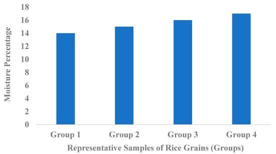 In the present study, mycoflora was isolated from rice grains to evaluate the contamination level in rice grains sold in the market. Samples collected were previously examined for moisture content and the prevalence of Aspergillus species. Environmental conditions, the critical ones being temperature and a high moisture content, influence fungal growth in foodstuffs. All samples were initially analyzed for moisture content to check for the relationship correlation (Y = 4.211 × X − 54.39) between the moisture level in rice grains and fungal growth. Four groups of samples were clustered according to their percentages: 14–14.5%, 15–15.5%, 15.6–16.5% and 16.6–17.9%, respectively, for group 1, group 2, group 3 and group 4, as shown in Figure 1.