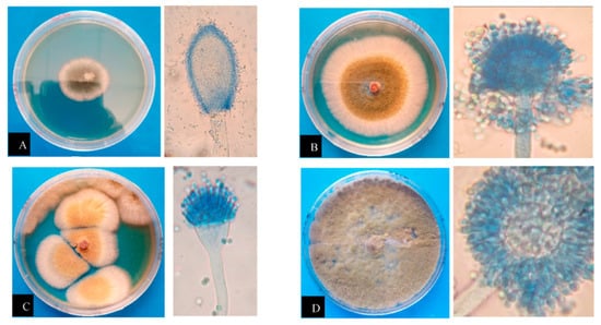 All the samples were positive for Aspergillus, with a total of eight (8) fungal strains, including, Aspergillus clavatus, Aspergillus flavus, Aspergillus fumigatus, Aspergillus nomius, Aspergillus oryzae, Aspergillus parasiticus, Aspergillus versicolor, and Aspergillus spp., being observed. These strains were purified based on their distinct morphology on malt extract agar (MEA) and potato dextrose agar (PDA) plates and differentiated based on their macroscopic and microscopic characteristics. Macroscopic identification was based on colony and reverse color, diameter, exudates, and texture. On the basis of the macroscopic study, isolates could not be differentiated. Further microscopic study involved the arrangement, color, diameter, shape, size, wall characters, cellular contents, conidial heads, conidiophore, sterigmata, conidia, and conidial arrangements, which were observed with a microscope []. The macroscopy and microscopy characteristics of fungal isolates are presented in Figure 2.