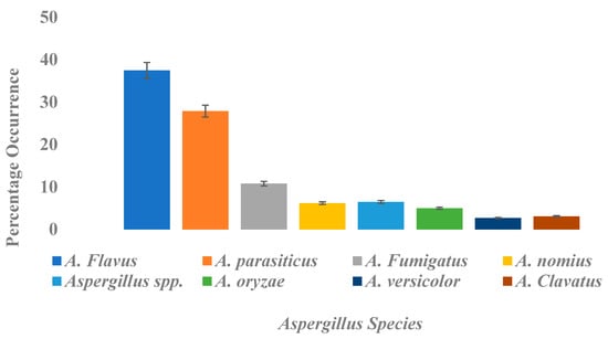 Occurrence of different Aspergillus species isolated from rice grains presented as a percentage.
