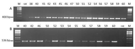 Polymerase chain reaction (PCR) amplicons of (A) the 400 bp product of aflD and (B) the 536 bp product of aflM markers. M: molecular weight marker 1 kb (Solis Biodyne, Tartu, Estonia); -ve: negative control. Numbers are the code of samples Figure S4.
