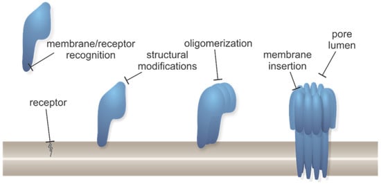 Although structural features and properties of pores formed by PFPs are substantially diverse, their activity can be targeted in a similar manner, as the molecular mechanism of action basically follows a common pathway. Generalized steps in the molecular mechanism of pore formation of PFPs together with steps allowing potential inhibition are illustrated in Figure 2.