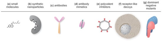 Below we describe possible approaches, from small organic molecules to relatively large organic particles, peptides, or proteins and discuss their relevance. However, the standard approach used in drug design, of targeting proteins with small molecules, is not commonly employed in the case of PFPs. PFPs have a specific mode of action that involves large protein surfaces and only rarely provides cavities or binding sites that could be used for small-molecule drug development. For a successful blockage, an important role is played by the size, conformation, symmetry, and structural plasticity of the inhibitor. Therefore, the diversity of potential inhibitors encompasses small organic molecules to relatively large organic particles, peptides, or proteins. Lately, there has been an ascent of alternative binding scaffolds with similar binding characteristics as antibodies, yet overcoming some of their weaknesses, such as high cost, challenging production protocols, and low production yield [82]. Furthermore, there are some less conventional ways for the neutralization of toxin activity, for instance the utilization of dominant negative mutants [83] and receptor decoys [84,85,86]. The representatives of all discussed inhibition strategies are presented in Figure 3.