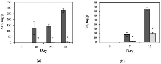 Effect of L. plantarum CECT 749 CFS on mycotoxin production: (a) AFB1 content (ng/g) in corn kernels contaminated with A. flavus ITEM 8111 at different storage times (0, 10, 25 and 40 days). Control samples (dark grey) and treated samples (clear grey); (b) FB1 content (ng/g) in corn ears contaminated with Fusarium verticillioides CECT 2982 at different storage times (0, 7 and 15 days). Control samples (dark grey) and treated samples (clear grey). (*) Represents a significant difference among the treatments (p ≤ 0.05). The experiment was carried out twice with analyses in triplicate (n = 6).